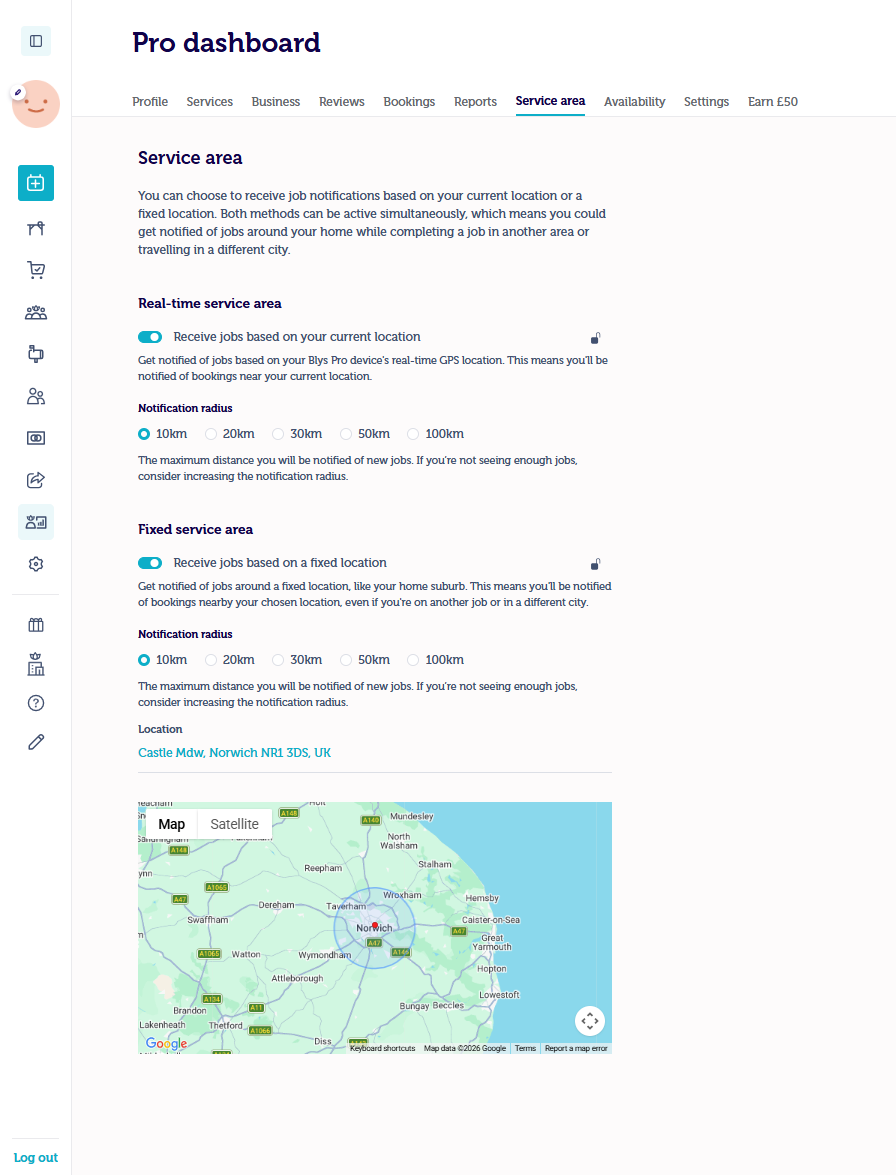 - Fixed service area | Receive jobs based on a fixed location: This means you'll be notified of bookings nearby your chosen location, even if you're on another job in a different city.