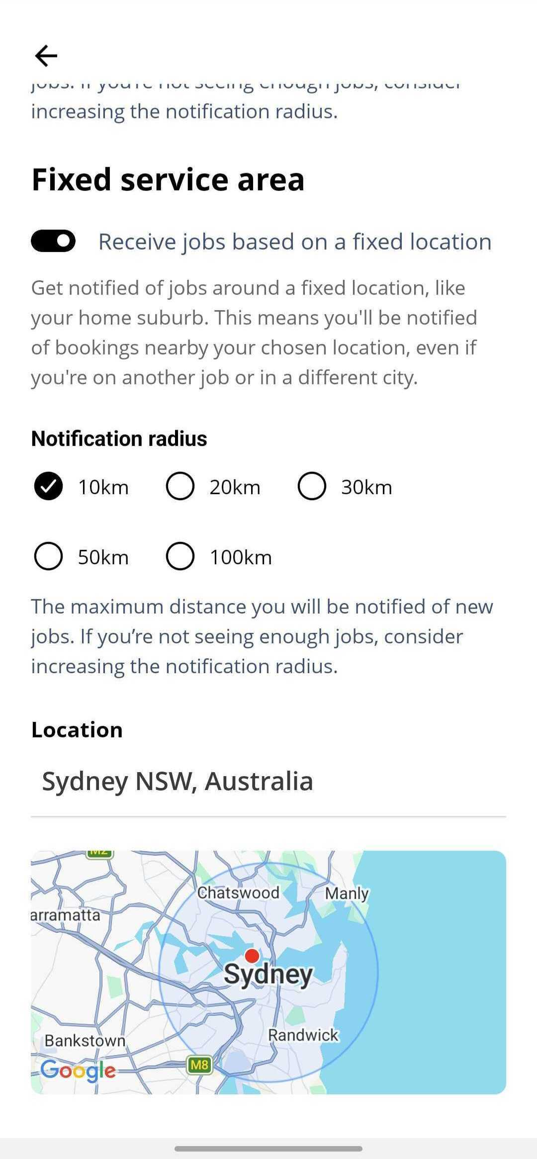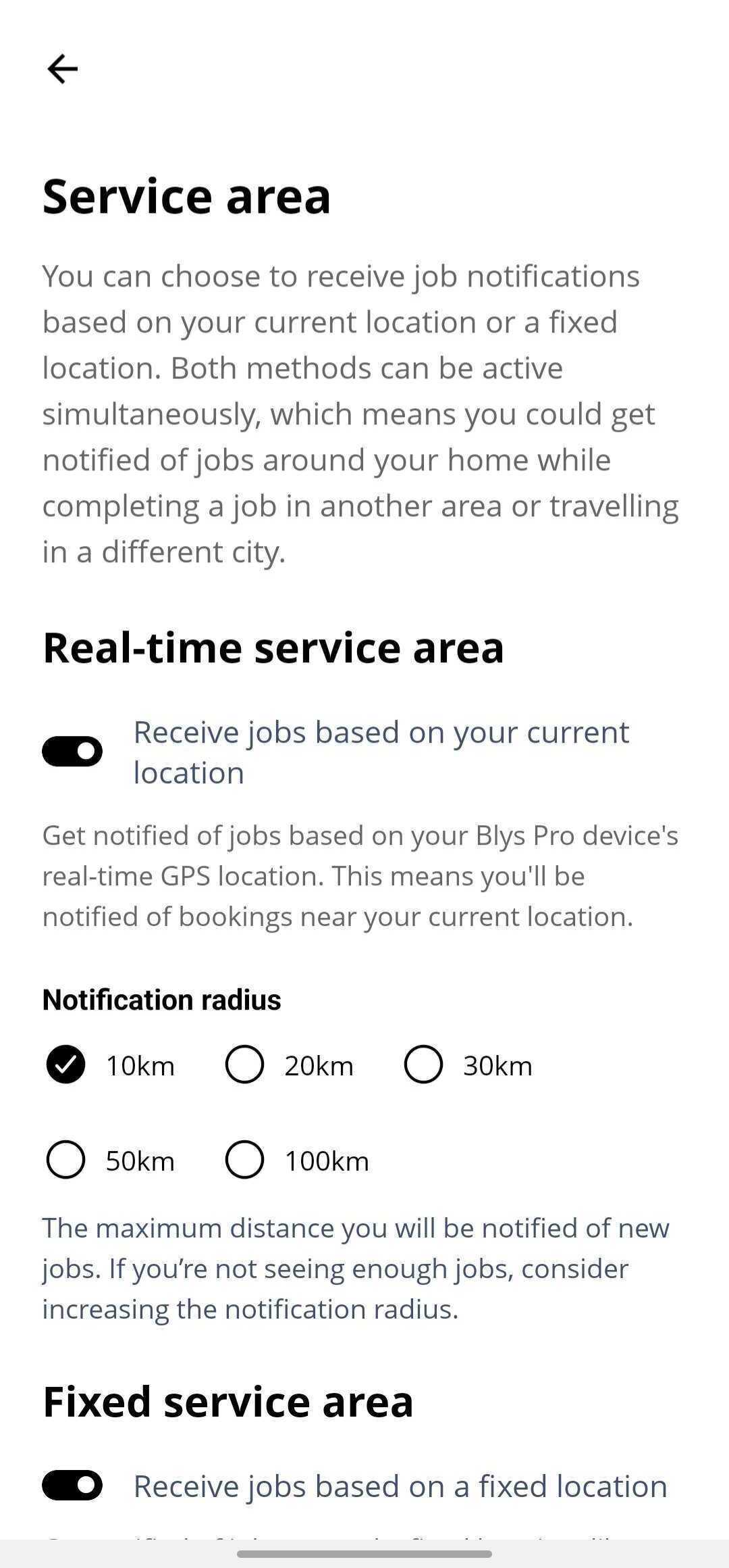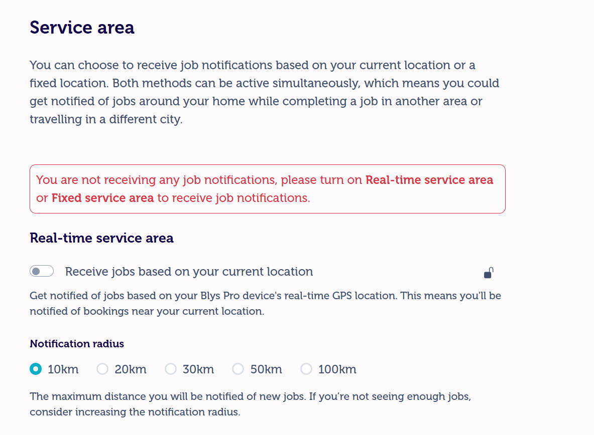 - Real-time service area | Receive jobs based on your current location: This means you'll be notified of bookings near your current location. You can set up your notification radius to 10km, 20km, 30km, 50km, and 100km.